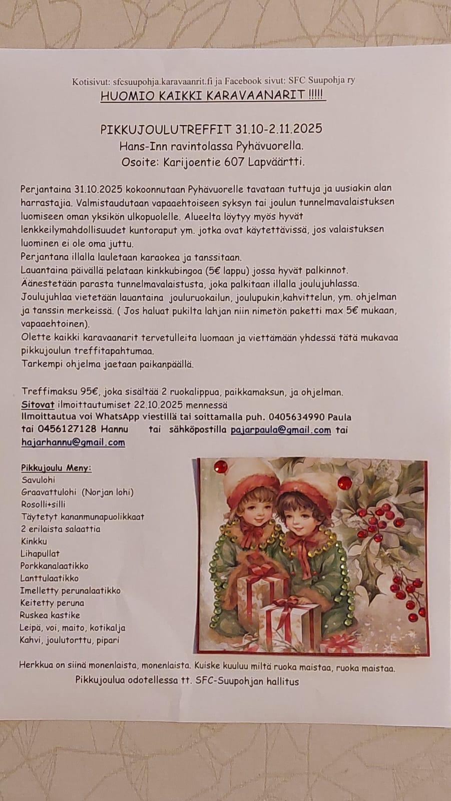 Kokoontuminen alkaa perjantaina klo.12. Viikonlopun ohjelmassa mm. karaokea, kinkkubingo ym. mukavaa. Pikkujoulunvietto alkaa lauantaina jouluruokailulla Pyhävuoren näköalaravintolassa. Iltajuhlaa vietetään joulupukin vierailun, ohjelman ja tanssin merkeissä. Tarkempi ohjelma julkaistaan lähempänä tapahtumaa.